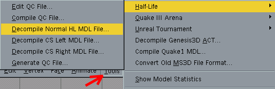 Utilizamos la opción de la barra de menú 'Tools \ Half-Life \ Decompile Normal HL MDL File...':